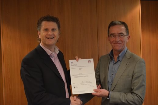Bijschrift bij foto: overhandiging van het ISO 27001 certificaat door Henny Raadschilders (links) van Triple A Security aan Francois Lenaerts (rechts) van Mister Mail.