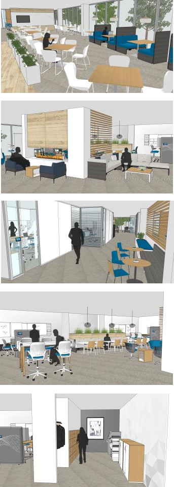Het WorkCafé omvat vijf verschillende zones die verschillende werkvormen en sociale interactie ondersteunen, gebaseerd op het principe dat medewerkers die keuze en zeggenschap over hun werkplek hebben een hoger welzijn ervaren: