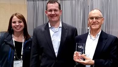 Juliet Forte van Kaseya, Charles Weaver van MSPA en Ray Wright van Kaseya met de ‘Best MSP Solution’-award op MSPWorld.