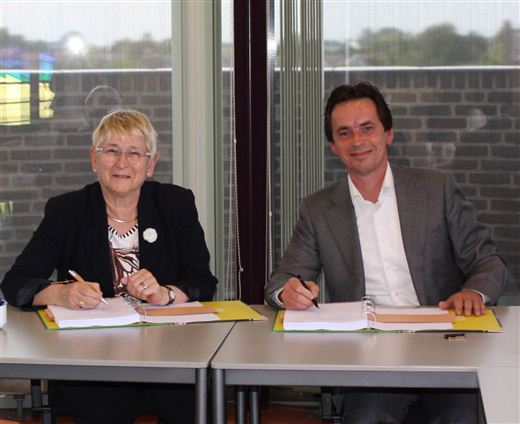 Burgemeester Wolfs van gemeente Onderbanken en de heer Rossieau, algemeen directeur van Circle Software, ondertekenen het contract.