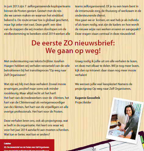 Sinds 2013 is de Twentse zorgorganisatie De Posten gestart met het transitieproces ‘Op weg naar Zelf Organiseren’. Om nog beter gebruik te kunnen maken van de expertise van de medewerkers zelf. En hen aan te zetten tot meer proactieve inbreng, om uiteindelijk de zorg nog beter af te kunnen stemmen op de cliënten. “Tot die tijd werd dat ook niet van medewerkers gevraagd” zo verklaart Eugenie Gosselink, projectleider Zelf Organiseren bij De Posten. “Ons systeem was daar ook niet op ingericht; die zorg leveren die de cliënt nodig heeft, binnen het gegeven budget, dat was de verantwoordelijkheid van het management. Maar hoe laag wil je die verantwoordingen nu gaan leggen? Hoe stuur je dat aan?