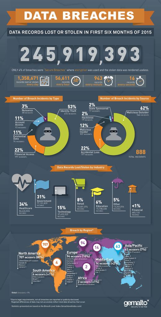 Breach Level Index Report H1 2015 voor een complete samenvatting van datalekincidenten per sector, bron, soort en geografische regio.