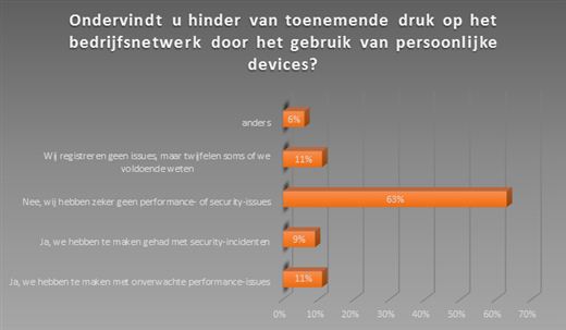 Telindus onder 115 Nederlandse IT-beslissers. 63 procent van de respondenten geeft aan nog geen hinder te ondervinden van toenemende druk op het bedrijfsnetwerk door het gebruik van persoonlijke devices, zoals performance- of security-issues. Om security- (92%) en beheerredenen (33%) is het bij 43 procent van de organisaties niet toegestaan om persoonlijke devices aan te sluiten op het bedrijfsnetwerk.