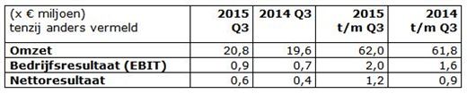 “Ook in het derde kwartaal van 2015 hebben we de opgaande lijn doorgezet. Bij een iets hogere omzet over de eerste negen maanden van 2015, nam het netto resultaat toe met 0,3 miljoen euro ofwel 41% naar 1,2 miljoen euro. De bruto marge steeg over dezelfde periode met 0,7 miljoen euro naar 43,0 miljoen euro, terwijl de bedrijfslasten stegen met 0,3 miljoen euro. Hierdoor nam het bedrijfsresultaat per saldo toe met 0,4 miljoen euro ofwel 21% naar 2,0 miljoen euro.