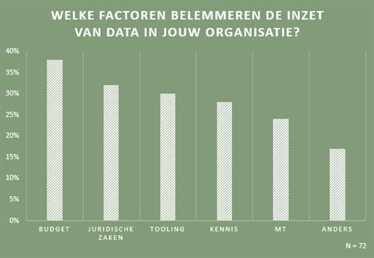 De ondervraagde marketeers zijn overtuigd van de economische kansen van data. De aspiraties worden nu nog tegengehouden door interne drempels binnen organisaties. Budget is de vaakst genoemde belemmering onder marketeers (38%), maar ook juridische zaken (32%) en een gebrek aan de juiste tooling (30%) verhinderen dat de kansen van data door bedrijven worden benut. Een kwart van de marketeers ziet daarnaast het managementteam als blokkade.
