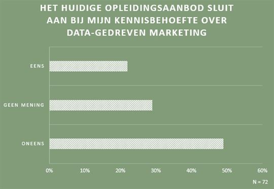 Marketeers willen graag hun kennis op het gebied van data vergroten, blijkt uit het onderzoek. De helft vindt echter dat het huidige opleidingsaanbod niet aansluit op hun kennisbehoefte. Rutten: ‘Dat is ons vertrekpunt en een signaal dat de Data Academie op het juiste moment is opgericht. Blijkbaar voldoen de huidige opleiders niet aan de kennisvraag. Daarom staan bij de Data Academie alle individuele cursussen en in-housetrajecten onder begeleiding van de beste data-experts en blijven we evalueren en ons cursusaanbod uitbreiden.’