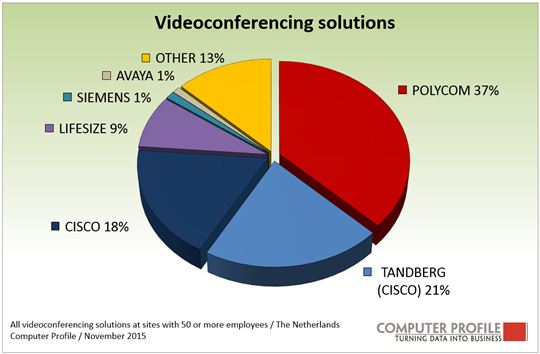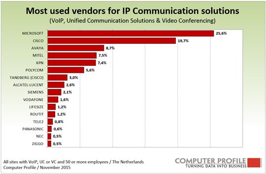 Breda, 3 december 2015 – Microsoft is de meest gebruikte leverancier op het gebied van Voice over IP (VoIP), Unified Communications en videoconferencing. Iets meer dan een kwart (25,6%) van alle oplossingen op dit gebied is van Microsoft. Cisco is de nummer twee met een gecombineerd aandeel van circa 22 procent van de oplossingen. Naast de Cisco (VoIP)-spraakoplossingen kunnen ook de Tandberg videoconferencing-oplossingen op het conto van Cisco worden bijgeschreven. Mitel, Avaya en KPN maken de top 5 op dit gebied compleet. Dit blijkt uit