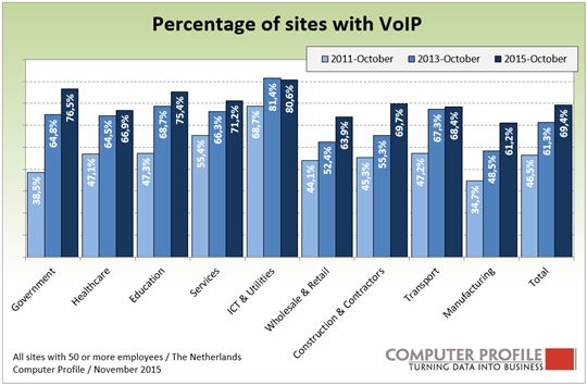 Het leeuwendeel (69%) van de bedrijfsvestigingen maakt gebruikt van een VoIP-toepassing. Naast de penetratie naar branches, weergegeven in de figuur, is er ook gekeken naar het gebruik in samenhang met de omvang van de locatie. Dan blijkt dat bij locaties met 500 of meer werknemers de VoIP-penetratie boven de 75 procent ligt, bij locaties met 200 tot 500 werknemers op 73 procent, bij bedrijven met 100 tot 200 werknemers op 68 procent en bij locaties met 50 tot 100 medewerkers ligt de VoIP-penetratie op 65 procent.