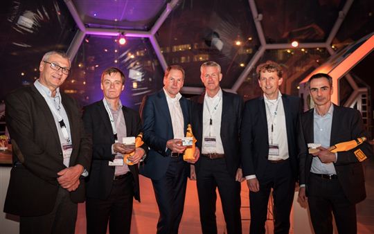 Foto van de winnaars en uitreikers van de Awards. Van links naar rechts: