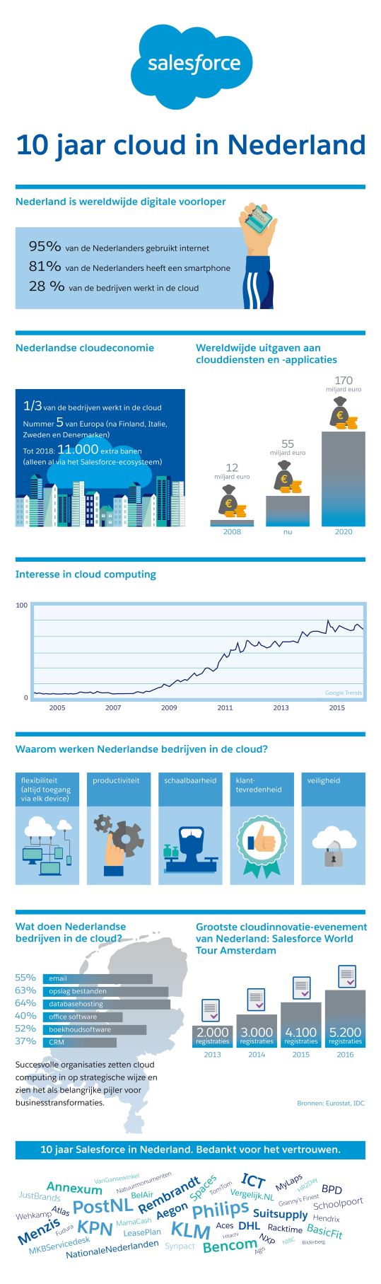 Nederland is al jaren voorloper op het gebied van internetpenetratie (95%) en smartphonegebruik (81%). Ook als het gaat om de inzet van de cloud computing door bedrijven gaat deze vlieger op. 28% van de Nederlandse bedrijven maakt anno 2016 gebruik van clouddiensten en -applicaties. Een van de belangrijke aanjagers van deze ontwikkeling is Salesforce, de cloudleverancier die deze maand haar 10-jarig bestaan in Nederland viert.