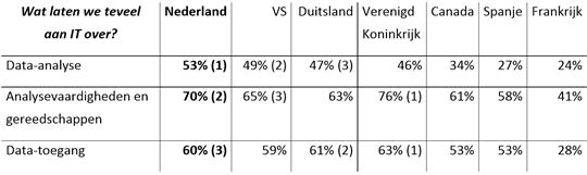 Er is veel voor te zeggen om kostbare en kwetsbare informatie centraal op te slaan. IT is er dan om de data vast te leggen en te bewaren, om gegevens toegankelijk te maken en te beveiligen. Maar voor de analyse en het creëren van waarde, moeten de decentrale afdelingsmanagers hun leidinggevende rol nemen en beschikken over de toegang tot de data, over de vaardigheden en de benodigde gereedschappen. Op al die vlakken scoren Frankrijk, Spanje en Canada stukken beter dan Nederland, het Verenigd Koninkrijk, Duitsland en de VS.