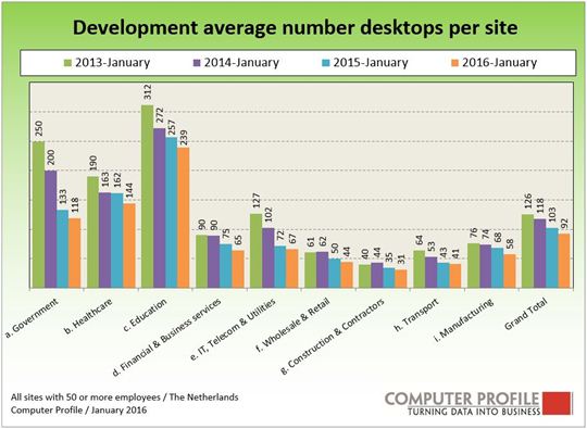 Wanneer er wordt gekeken naar het gemiddelde aantal desktops per locatie, dan is dit in de loop der jaren aan het afnemen. De meeste desktops worden nog steeds gebruikt in de publieke sector: onderwijs, gezondheidszorg en de overheid. Van deze drie worden er de meeste desktops binnen het onderwijs gebruikt. Het is aannemelijk dat de afname van desktops een resultaat is van de opkomst van tablets, hybrides en andere smart (mobile) devices.