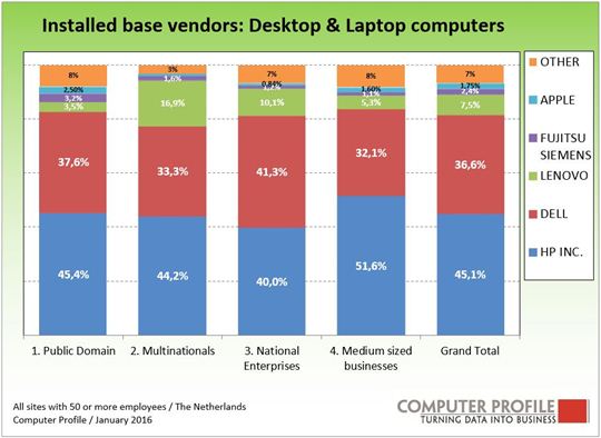 Het aandeel van HP Inc. is met circa 52 procent het hoogst bij bedrijfsvestigingen in het segment 50 tot 250 medewerkers in Nederland (medium sized businesses). Bij national enterprises (250 tot 2.500 medewerkers) is de ruimte die de concurrentie in weet te nemen het grootst en heeft HP Inc. een aandeel van 40 procent. Bijna 37 procent van alle pc’s is een systeem van Dell. Dell komt in Nederland het meest voor bij national enterprises. Voor Lenovo geldt dat het aandeel het grootst is bij de grotere bedrijfsvestigingen in Nederland. Fujitsu Siemens kent haar grootste aandeel voornamelijk in de publieke sector, in het bijzonder bij de overheid. Lenovo komt het meest voor in de branches ICT & Utilities (22%), Industrie (14%) en Handel (13%). De trend van de afgelopen jaren laat voor HP Inc. een relatief stabiel beeld zien. Het aandeel blijft tussen de 45 en 48 procent schommelen. Dell blijft vrij constant tussen de 33 en 36 procent. Fujitsu Siemens lijkt 3 procentpunt terrein te geven in de laatste vier jaar. Lenovo had in 2010 nog een aandeel van een kleine 3 procent en heeft dat de afgelopen jaren gestaag op weten te bouwen tot de huidige 8 procent.