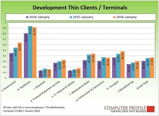 Het aandeel van thin clients in het totaal aantal gebruikte systemen is de laatste jaren aan het stijgen. Begin 2014 bedroeg het percentage thin clients 30 procent van het totaal aantal eindgebruikerssystemen, begin 2015 was dat 36 procent en inmiddels is dat verder gestegen naar ruim 37 procent. Binnen de overheid en de gezondheidszorg wordt het meest gebruikgemaakt van thin clients, respectievelijk 63,6 procent en 91,5 procent. Het zwaartepunt ligt bij organisaties tussen de 200 en 500 werknemers. Van al deze locaties worden er op ruim 44 procent thin clients gebruikt.