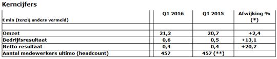 De totale bedrijfslasten daalden met € 0,3 miljoen naar € 13,8 miljoen. Het bedrijfsresultaat over het eerste kwartaal van 2016 kwam uit op € 0,6 miljoen (Q1 2015: € 0,5 miljoen).