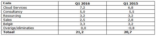 Op basis van de orderportefeuille, de versterking van het projectmanagement en de verdere toename van het omzetaandeel van onze Cloud-activiteiten, handhaven we onze eerder uitgesproken verwachting dat met voorbehoud voor bijzondere exogene omstandigheden, in 2016 een hoger resultaat zal worden behaald dan in 2015.”