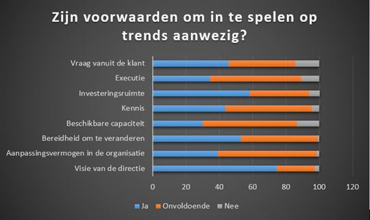 benchmark deelnemende bedrijven zijn gestart met de implementatie van game changers in de bedrijfsvoering. Hierbij blijkt dat een aantal voorwaarden niet of onvoldoende aanwezig is. 70 procent heeft problemen met capaciteit. Ook executie (65%) en aanpassingsvermogen (61%) zijn onvoldoende aanwezig om adequaat op transities in te spelen.