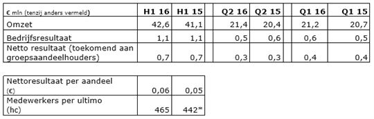 De omzet in de eerste helft van 2016 is gestegen met € 1,5 mln, ofwel 3,6%, van € 41,1 mln in de eerste helft van 2015 naar € 42,6 mln.