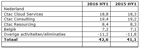 - Na eliminatie van de bedrijfsresultaten van Ctac Frankrijk (2016HY1 € 1,0 mio verlies, 2015HY1 € 0,6 mio verlies), stijgt het bedrijfsresultaat van de kernlanden Nederland en België van € 1,7 mln over het eerste halfjaar 2015 naar € 2,1 mln over het eerste halfjaar 2016