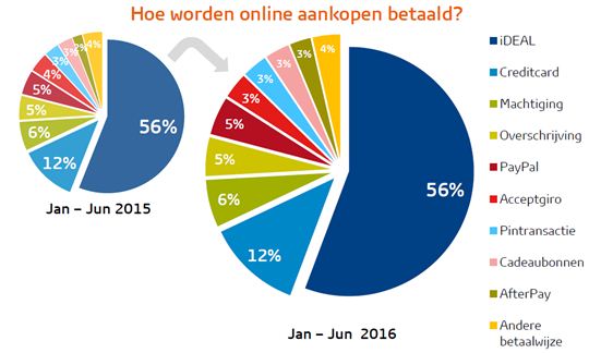 Het betaallandschap is in het eerste half jaar van 2016 niet veel veranderd ten opzichte van vorig jaar. Net als in het eerste half jaar van 2015, betalen Nederlanders hun online aankopen het vaakst met iDEAL. Het aandeel van iDEAL blijft stabiel op 56%. De acceptgiro verliest verder aan terrein, terwijl AfterPay haar aandeel bovengemiddeld ziet stijgen. Dit blijkt uit cijfers van de eCommerce Payment Monitor, het onderzoek naar betaalmethoden in Nederland dat wordt uitgevoerd door GfK, in samenwerking met iDEAL en Thuiswinkel.org.