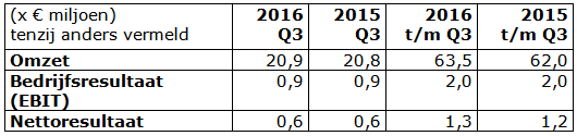 Het nettoresultaat over het derde kwartaal 2016 bedroeg € 0,6 miljoen (€ 618K) (derde kwartaal 2015: € 0,6 miljoen (€ 554K)). De stijging van bijna 12% werd met name veroorzaakt door een hogere brutomarge, in combinatie met een strikte beheersing van de bedrijfslasten. Daarbij moet worden opgemerkt dat in 2015 een opbrengst als gevolg van een WBSO subsidie (voor innovatieve inspanningen) van netto € 0,1 miljoen was opgenomen in de bedrijfslasten.