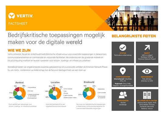 Vertiv is wereldwijd leverancier van bedrijfskritische infrastructuurtechnologieën voor essentiële toepassingen in datacenters, communicatienetwerken en commerciële en industriële omgevingen. Het bedrijf met het hoofdkantoor in Columbus, Ohio (VS) heeft meer dan 20.000 werknemers en meer dan 25 productie- en assemblagefaciliteiten over de hele wereld.
