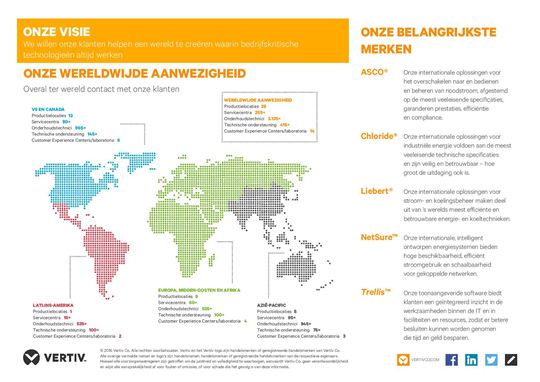 Vertiv ontwerpt, bouwt en onderhoudt bedrijfskritische infrastructuur voor essentiële toepassingen in datacenters, communicatienetwerken en commerciële en industriële faciliteiten. Vertiv, voorheen bekend als Emerson Network Power, ondersteunt de groeiende mobiele en cloudcomputing-markt met een portfolio van stroom-, koelings- en infrastructuurbeheeroplossingen met de merken ASCO
