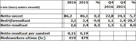 Het bedrijfsresultaat daalde in 2016 naar EUR 3,1 miljoen (2015 EUR 3,4 miljoen). Het gecorrigeerde bedrijfsresultaat dat een betere vergelijking biedt, steeg echter met 8% naar EUR 3,6 miljoen. De correctie betreffen de baten uit de innovatiebox (volgens IFRS regelgeving in 2016 verantwoord onder vennootschapsbelasting) en de dotatie aan een earn out-verplichting.