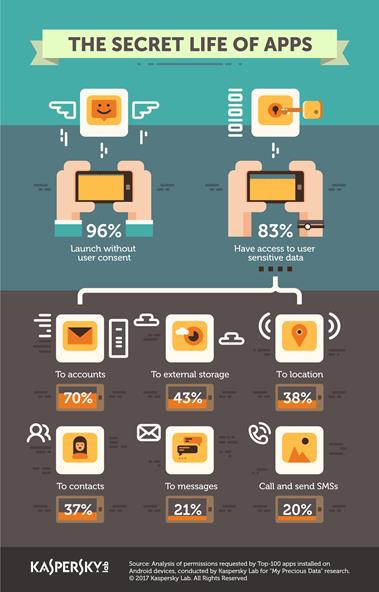 Eén van de grootste gevaren is dat de apps vanwege hun dagelijkse activiteiten zelf een risico kunnen vormen voor gebruikersgegevens en apparaten. Technische bevindingen van Kaspersky Lab laten zien dat van de 100 Android-apps die gebruikers kunnen beheren (d.w.z. installeren en verwijderen), er 83 toegang hebben tot vertrouwelijke gebruikersgegevens, zoals contactpersonen, berichten en gegevens. Ze kunnen zelfs bellen en sms-berichten verzenden. Extra bevindingen van KSN tonen hoe apps zonder toestemming van de gebruiker kunnen werken. Gemiddeld hebben gebruikers 66 apps op hun Android-apparaat. Tijdens het testen van een representatieve steekproef van 66 van de populairste Android-apps, bleken er 54 op de achtergrond te starten zonder dat de gebruiker zelf iets deed. Hierbij verbruikten ze per dag gemiddeld 22MB aan dataverkeer, zonder tussenkomst van de gebruiker.