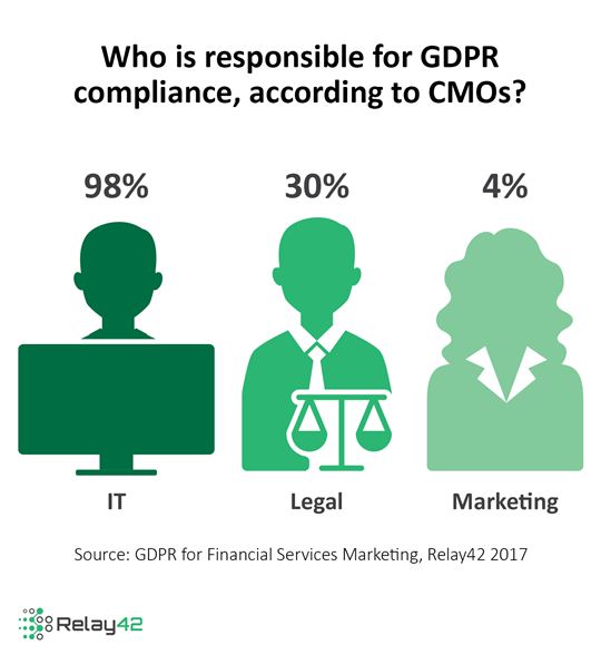 Amsterdam, 29 mei 2017 – Onderzoek van Relay42, aanbieder van een innovatief marketingdata management platform (DMP), heeft de grootste uitdagingen voor banken en andere financiële instellingen op het gebied van General Data Protection Regulation (GDPR) in kaart gebracht. Uit het onderzoek, dat in het Verenigd Koninkrijk is uitgevoerd, blijkt dat 98% procent van de marketeers op C-level (CMO’s) vindt dat GDPR de verantwoordelijkheid is van IT. Slechts 4% zegt dat marketing een rol speelt bij het voldoen aan de wet- en regelgeving.