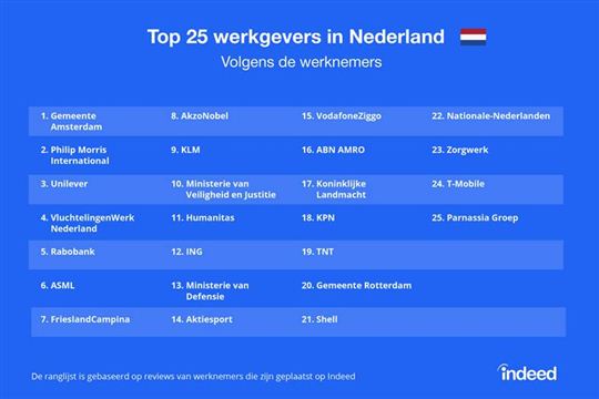 Indeed gebruikte de ervaringen van de werknemers om de volgende top 25 van beste werkgevers in Nederland samen te stellen.