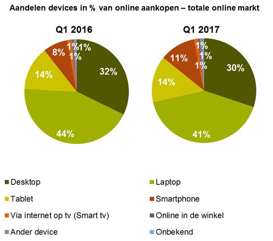 Ook de penetratie van smartphones bij het doen van online aankopen stijgt aanzienlijk. In het eerste kwartaal van 2017 heeft 24% van alle Nederlandse online kopers minimaal één keer een online aankoop gedaan via de smartphone. Dit komt neer op 2,61 miljoen Nederlanders. In Q1 2016 lag dit percentage nog op 18% en in Q1 2015 zelfs op 14%. De desktop laat als enige apparaat een daling zien onder online kopers; waar in Q1 2016 nog 39% van de online kopers minimaal één aankoop deed met de desktop is dit in Q1 2017 gedaald naar 36%.
