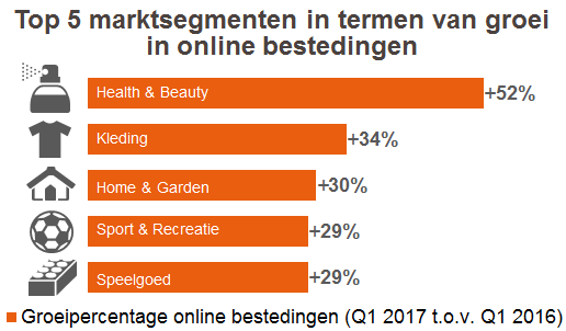 De online bestedingen binnen Health & Beauty (+52%) stijgen aanzienlijk. De totale uitgaven binnen dit segment (offline + online) stijgen slechts 5%, waardoor we kunnen concluderen dat het online kanaal een veel belangrijkere rol is gaan spelen binnen dit segment. Andere minder volwassen segmenten als Home & Garden (+30%) en Sport & Recreatie (+29%) laten ook een flinke groei in online bestedingen zien. In de meer volwassen online markten zoals Media & Entertainment en Huishoudelijke Elektronica, die al een hoger online aandeel hebben, zien we de online groei wat afzwakken. Binnen de Fashion-segmenten zet de online groei nog steeds sterk door, want Kleding groeit met 34% en Schoenen & Lifestyle met 24% ten opzichte van Q1 2016. In totaal groeien de online bestedingen binnen Fashion in de eerste drie maanden van 2017 met 30% ten opzichte van dezelfde periode vorig jaar.