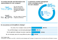 Een ander belangrijk resultaat van de enquête: de meerderheid van de 1.826 responderende CIO's, procesmanagers en IT-managers is zich goed bewust van wat er nodig is om uit deze situatie te komen. Toch volgen ze niet consequent een strategie. Een substantiële 85 procent van de respondenten ziet het belang van enterprise content management als een strategische prioriteit om de hier genoemde uitdagingen het hoofd te bieden. Slechts 41 procent streeft momenteel echter de nodige ECM-platformstrategie na - op zijn minst op afdelingsniveau en nog niet in het hele bedrijf. Nog eens 41 procent moet nog een ECM-strategie toepassen en 18 procent is bezig met het formuleren ervan.