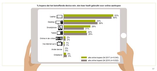 Het percentage online kopers dat minimaal één keer gebruik had gemaakt van een tablet voor het doen van online aankopen, steeg nog ieder kwartaal van 2016. Sinds het eerste kwartaal van 2017 is de penetratie van de tablet voor het doen van online aankopen echter vrijwel stabiel gebleven. De populariteit van de smartphone binnen e-commerce is wel blijven stijgen, waardoor de penetratie van de smartphone bij online aankopen vanaf het tweede kwartaal van 2017 voor het eerst hoger ligt dan de penetratie van de tablet. In Q4 2017 geldt dat 28% van de online kopers bij minimaal een van hun aankopen een smartphone heeft gebruikt en 24% een tablet. In Q4 2016 was dit voor de smartphone nog 21% van de kopers en voor de tablet 25%.