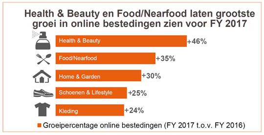 Waar het in 2016 vooral de segmenten Schoenen & Personal Lifestyle, Verzekeringen, Food/Nearfood en IT waren die een aanzienlijke online groei lieten zien, zijn in 2017 Health & Beauty, Food/Nearfood en Home & Garden de grootste stijgers in termen van online bestedingen.