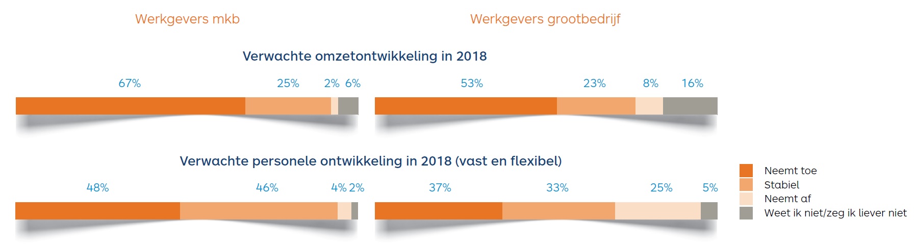 Hoewel er een flinke economische groei wordt voorspeld, blijft de te verwachten personele groei achter. Minder dan de helft (48%) van het mkb denkt dat het aantal werknemers toeneemt. Het grootbedrijf verwacht een groei van 37 procent in het aantal fte. Organisaties denken dus de omzetgroei te behalen met relatief minder mensen.