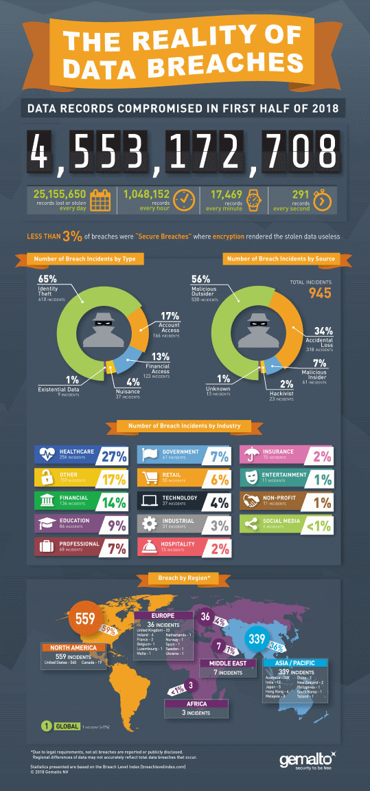 Breach Level Index, een wereldwijde database van inbreuken op openbare gegevens. Maar liefst 945 datalekken worden daarin onthuld, waardoor in de eerste helft van 2018 wereldwijd 4,5 miljard records werden aangetast. Vergeleken met dezelfde periode in 2017 steeg het aantal verloren, gestolen of aangetaste records met 133 procent, terwijl het totale aantal inbreuken enigszins afnam in deze periode. Dit duidt op een toename van de ernst van elk incident.