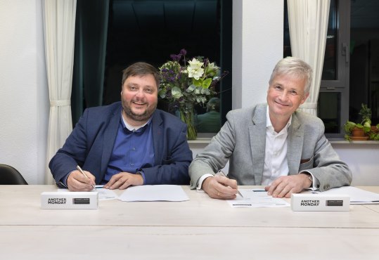Noot voor de redactie: in de bijlage een foto op hoge resolutie van de ondertekening door v.l.n.r. Arjen van Berkum (Another Monday) en Engbert Verkoren (Conclusion).