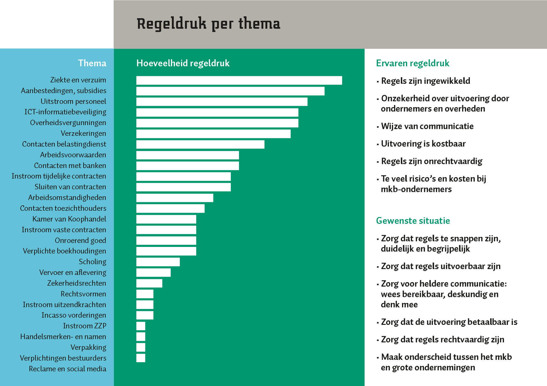 De meeste regeldruk ervaren ondernemers bij ziekte en verzuim van werknemers, aanbestedingen en subsidies en bij uitstroom van personeel. Ook ICT-informatiebeveiliging, overheidsvergunningen en verzekeringen zorgen voor een hoge regeldruk. Oorzaken van de ervaren regeldruk zijn de complexiteit van de regels, onzekerheid over de uitvoering, de wijze van communiceren en de hoeveelheid risico’s en kosten die bij de ondernemers liggen.