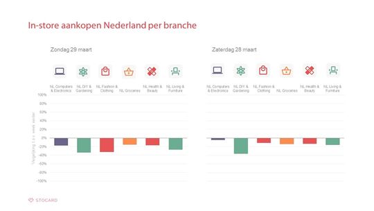 Tuincentra en bouwmarkten laten de grootste daling zien dit weekend. Afgelopen zondag hadden ook kledingwinkels en meubelzaken het moeilijk. Waar eerder nog bepaalde branches een toename in aankopen lieten zien, hebben Nederlanders dit weekend gehoor gegeven aan het advies van de overheid om zoveel mogelijk thuis te blijven. Geen enkele branche kan meer van positieve cijfers spreken.