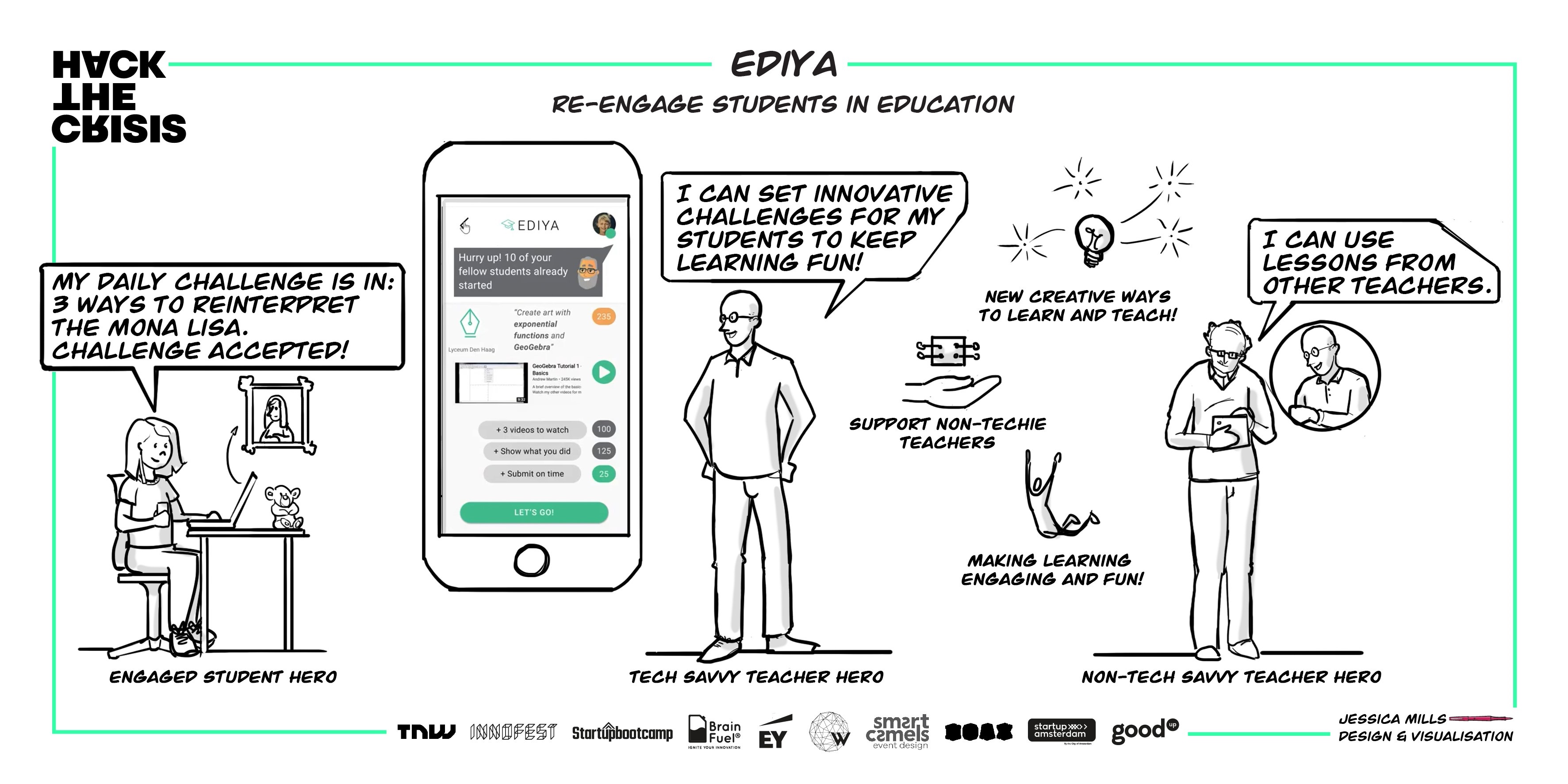 De winnende deelnemers startten hun hackathon door duizenden leerkrachten van over de hele wereld te vragen tijdens deze periode van langdurig afstandsonderwijs hun grootste uitdaging is. Hun antwoord: het blijven motiveren van de thuiszittende leerlingen. Om dit probleem aan te pakken, bedacht het team het platform ‘Ediya’. Hierop kunnen leerkrachten door samen te werken en