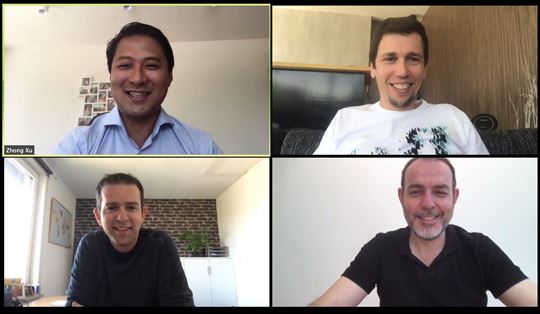 Foto: Deliverect oprichters & leadership team: Zhong Xu (CEO), Jan Hollez (CTO), Jelte Vrijhoef (Sr Architect)-links onder-, Jérôme Laredo (CRO) -rechts onder-