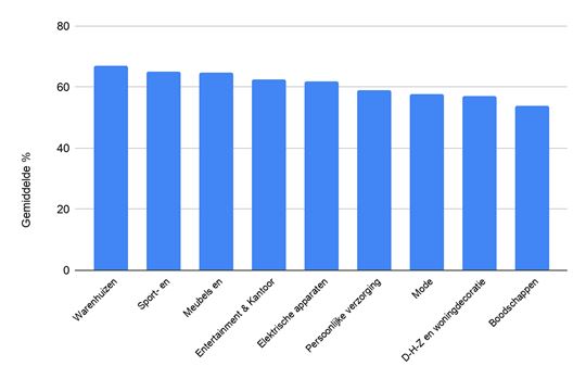 Verder gaat de gedeelde tweede plaats - met allebei een score van gemiddeld 65% - naar de categorie ‘sport- en vrijetijdsartikelen’ met webwinkels van onder andere de ANWB en Decathlon en de categorie ‘meubels en woninginrichting’ met online winkels zoals wederom Wehkamp en Bol.com.