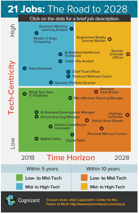 Robert Brown, Vice President bij Cognizant’s Center for the Future of Work, zegt: “Dit is voor HR het ‘moment van de waarheid’, waarin ze organisaties kunnen leiden naar een werkomgeving waarin mens en machine klaar zijn voor de toekomst. Banen en rollen zoals hierboven beschreven zijn integraal met die toekomst verbonden.”