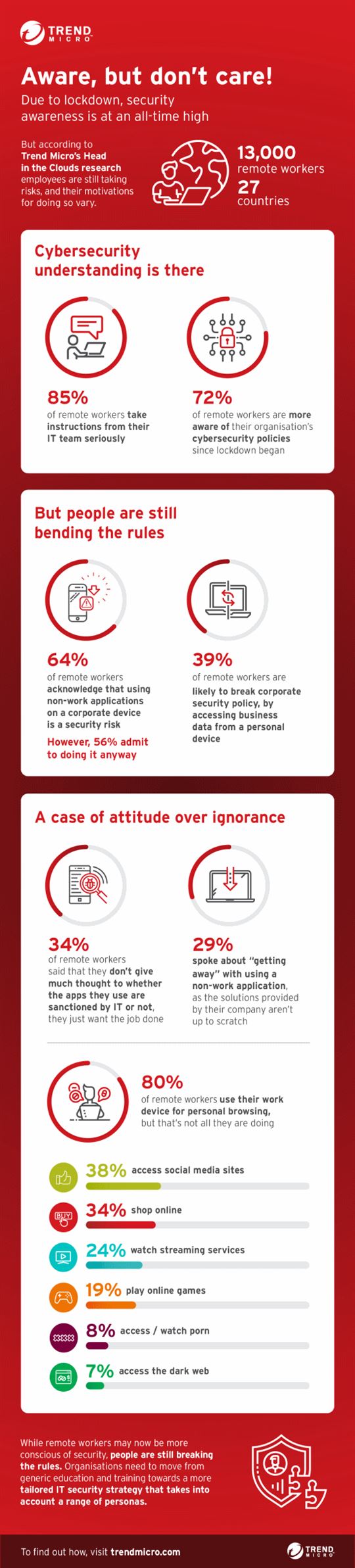 Het Trend Micro Head in the Clouds-rapport is gebaseerd op interviews met 13.200 thuiswerkers in 27 landen, waaronder Nederland. De vragen gingen over hun houding ten opzichte van corporate cybersecurity- en IT-beleid. Het laat zien dat er nooit eerder zoveel bewustwording is geweest over cybersecurity onder werknemers. Het onderzoek onderstreept tevens dat de aanpak die bedrijven hebben op het gebied van training erg belangrijk is om ervoor te zorgen dat security-beleid ook wordt uitgevoerd.