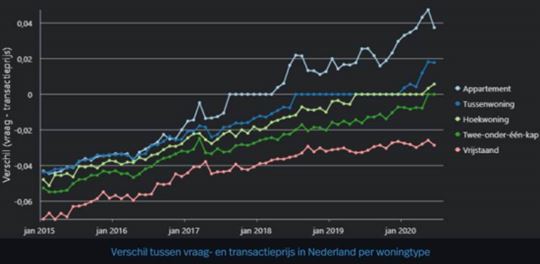 Kopers slaan steeds sneller hun slag en betalen daarbij vaak meer dan de vraagprijs! Dit beeld wordt sinds begin 2019 steeds overtuigender. De afgelopen 5 jaar zien we duidelijk dat de gemiddelde verhouding tussen de vraagprijs en de koopsom toeneemt. Sinds begin 2020 wordt er landelijk bij vrijwel alle woningtypen, vrijstaand uitgezonderd, overboden op de vraagprijs.